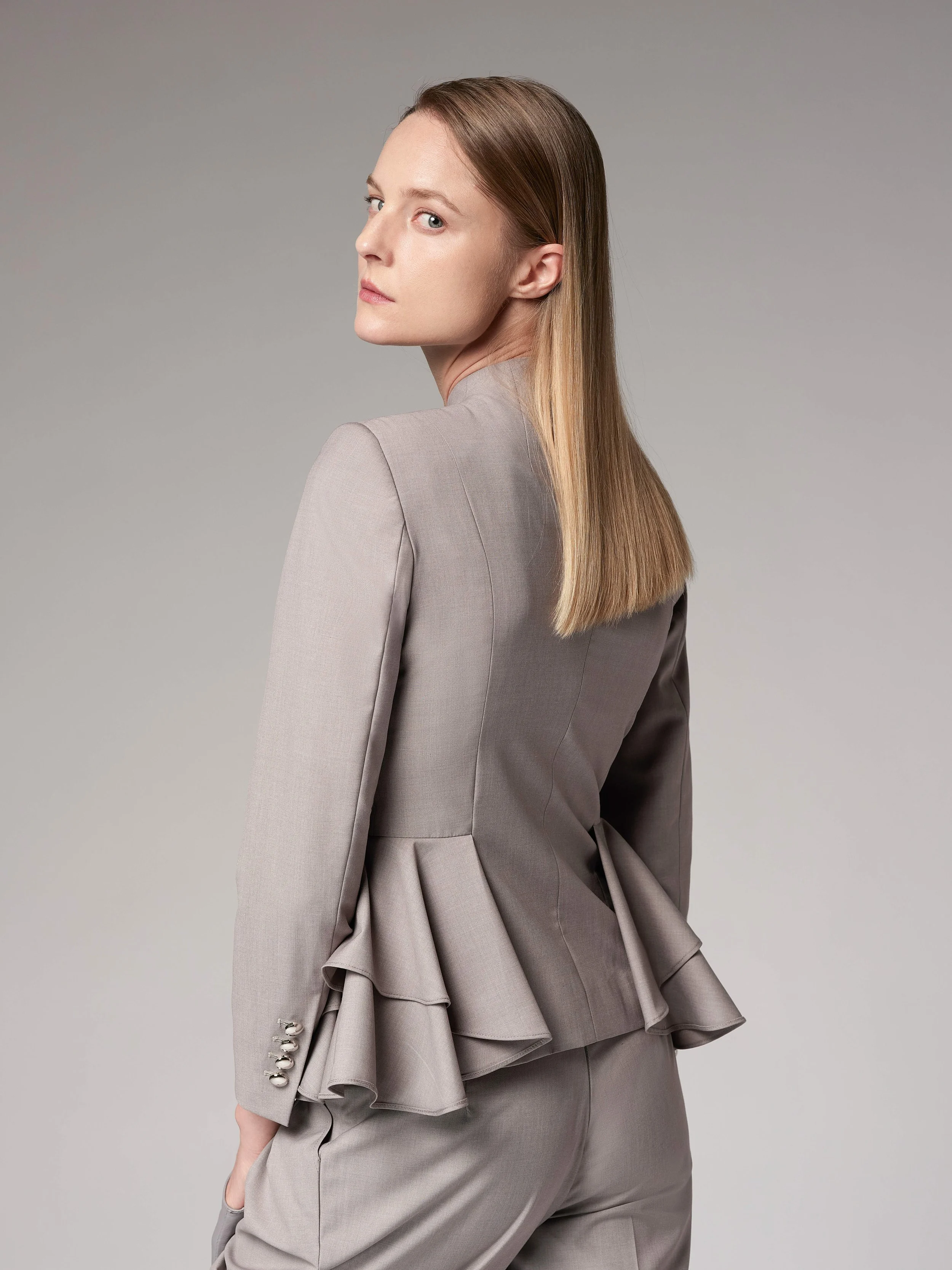 Structured with precision, this suit reveals its artistry in the layered peplum that sweeps from back to front, sculpting movement into every line.