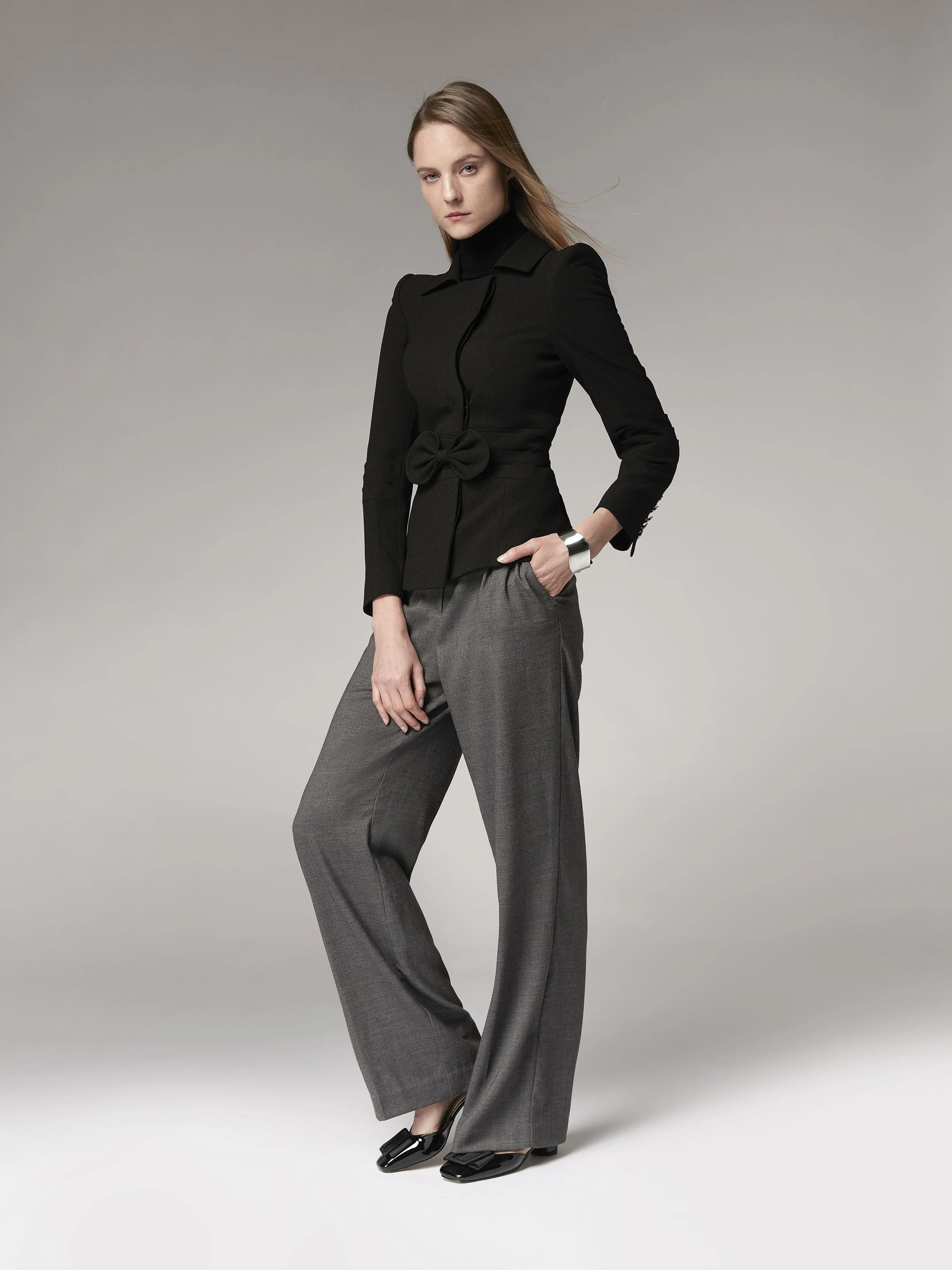 A bow cinches the waist, while the subtle peplum accentuates the body with architectural grace.